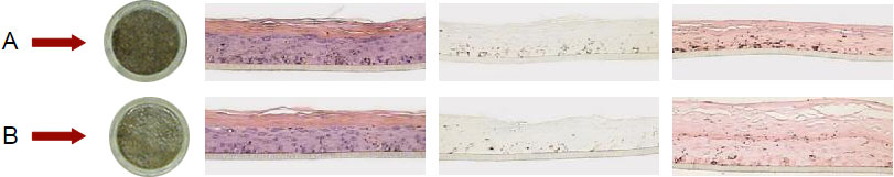 Repeated applications of the skin care cream decrease the tanning degree (B) as compared to the untreated control (A). By Fontana Masson staining, we note a correlation between reduced pigmentation and lower melanin content present in the melanocytes.